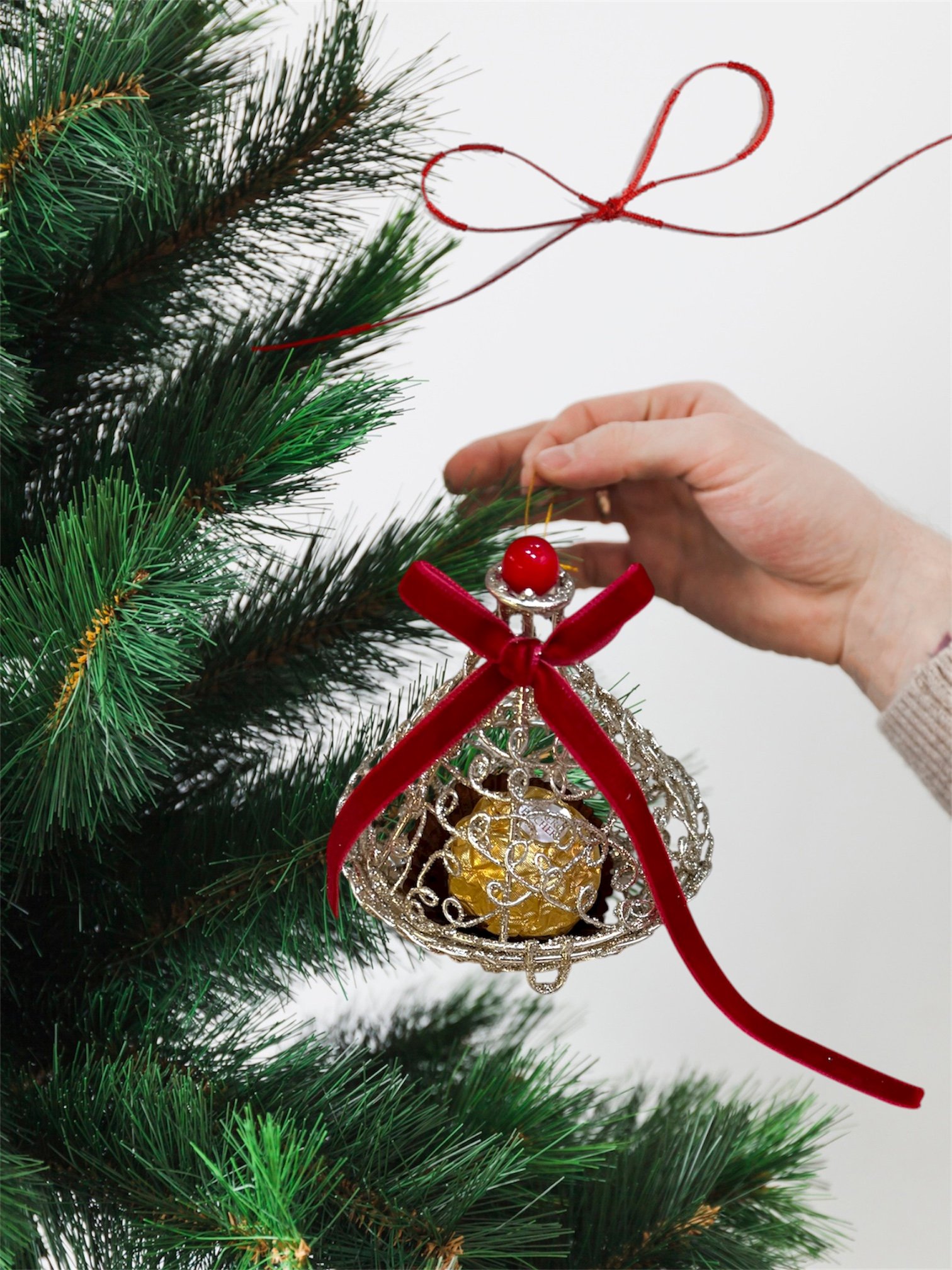 Ajoutez une touche d’élégance et de gourmandise à votre sapin avec ce lot de 2 suspensions dorées brillantes, ornées d’un ruban rouge satiné et de petites perles décoratives.