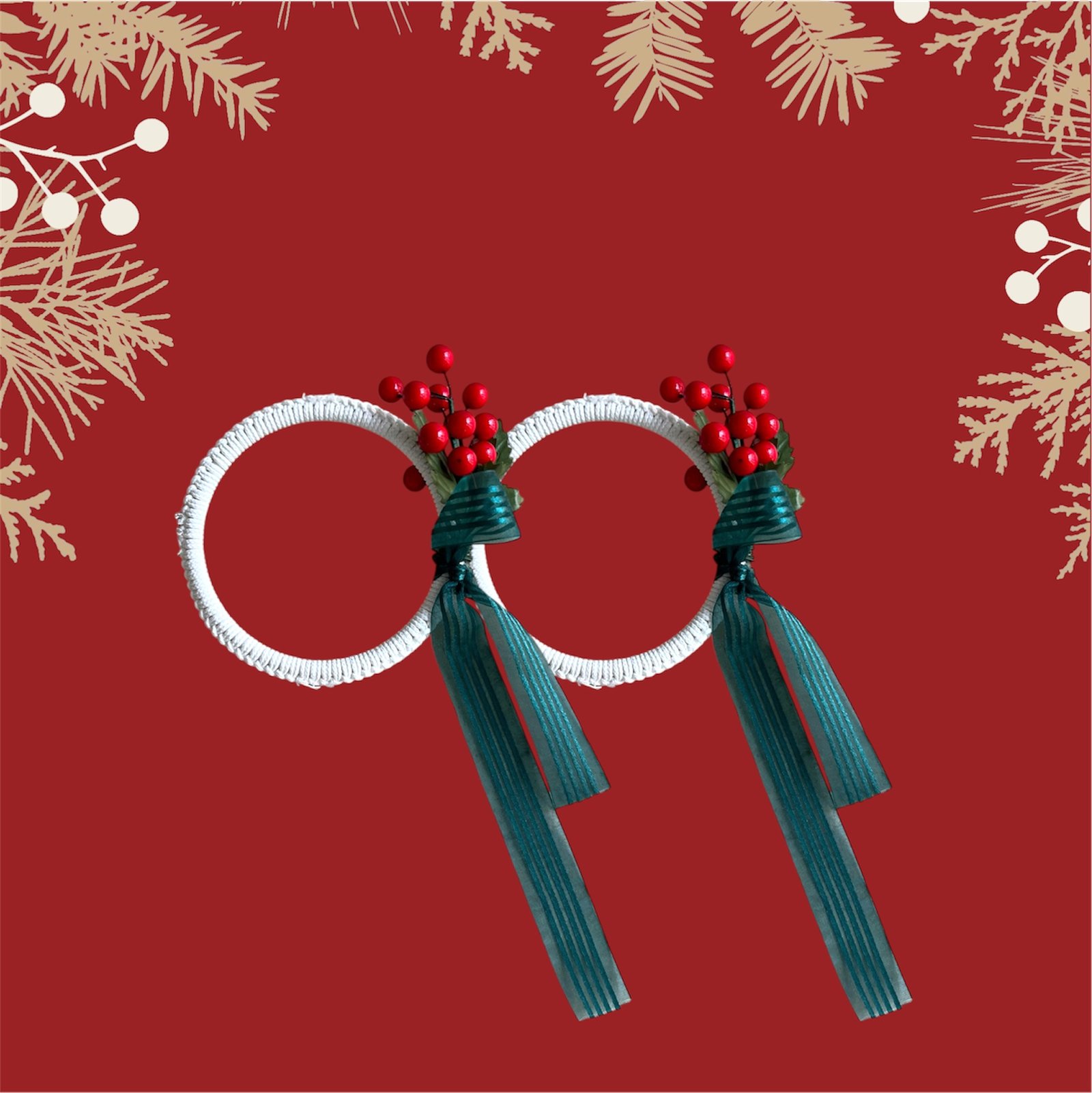 Apportez une touche d’élégance à votre sapin avec ce superbe duo d’ornements au fil blanc délicat, décorés d’un ruban vert émeraude ainsi que de baies rouges de Noël.