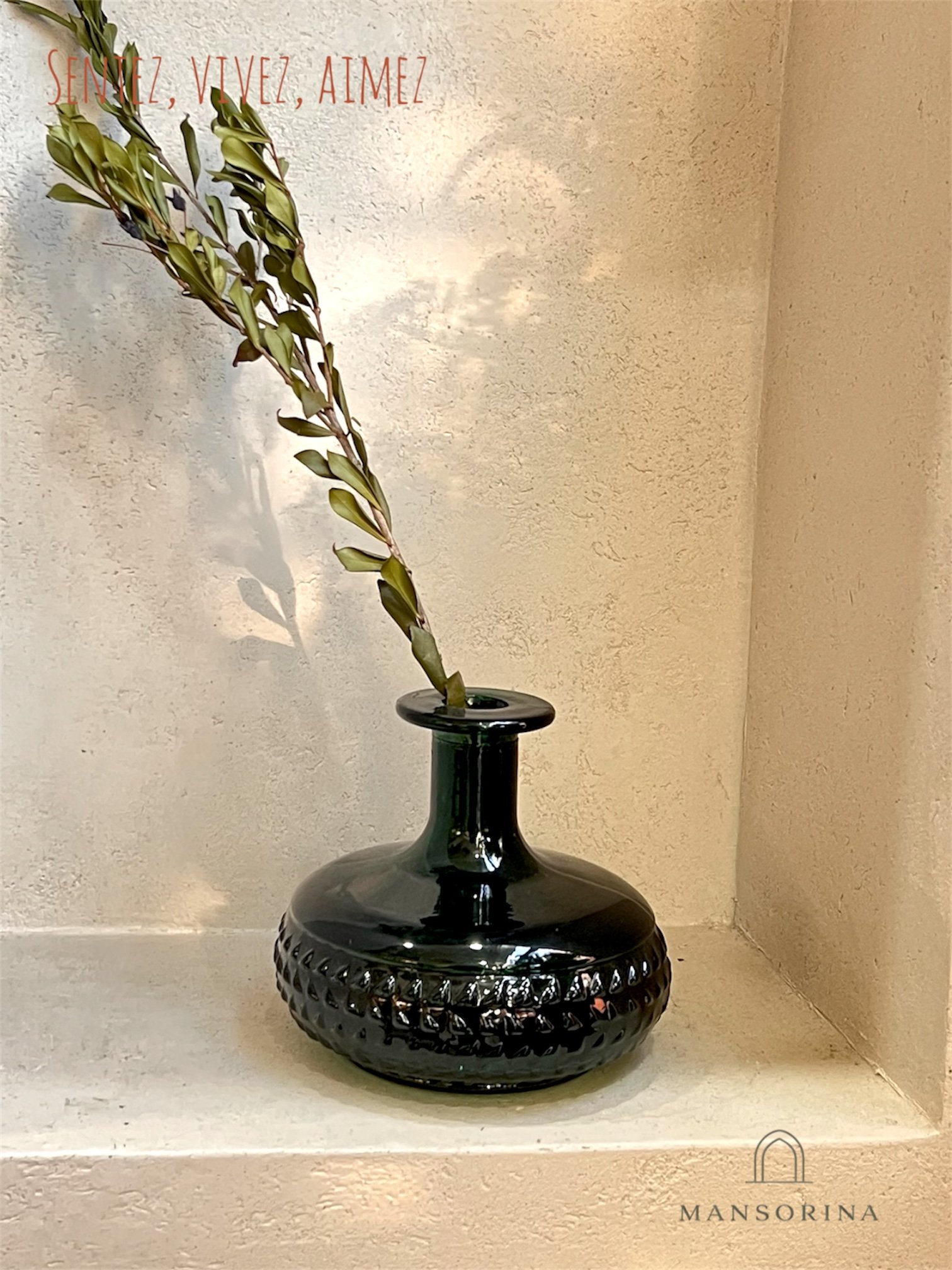 Apportez une touche de douceur et de naturel à votre intérieur avec ce vase couleur vert emeraude en verre recyclé, d’environ 12 cm de hauteur ( sans tiges). Son design épuré met en valeur la beauté de la matière : un verre délicatement teinté, qui capte la lumière avec subtilité.