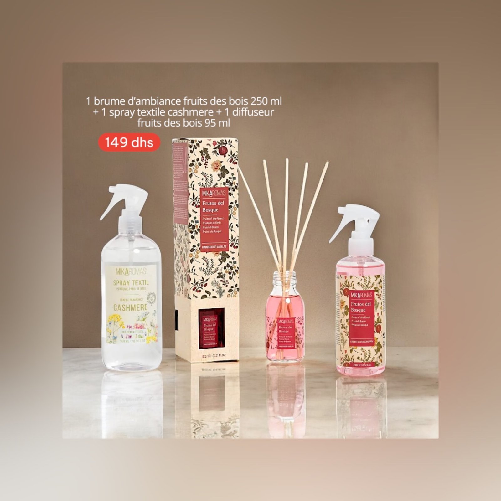 Spray d’ambiance Fruits des Bois – 250 ml : un parfum fruité et chaleureux qui embaume instantanément votre intérieur.