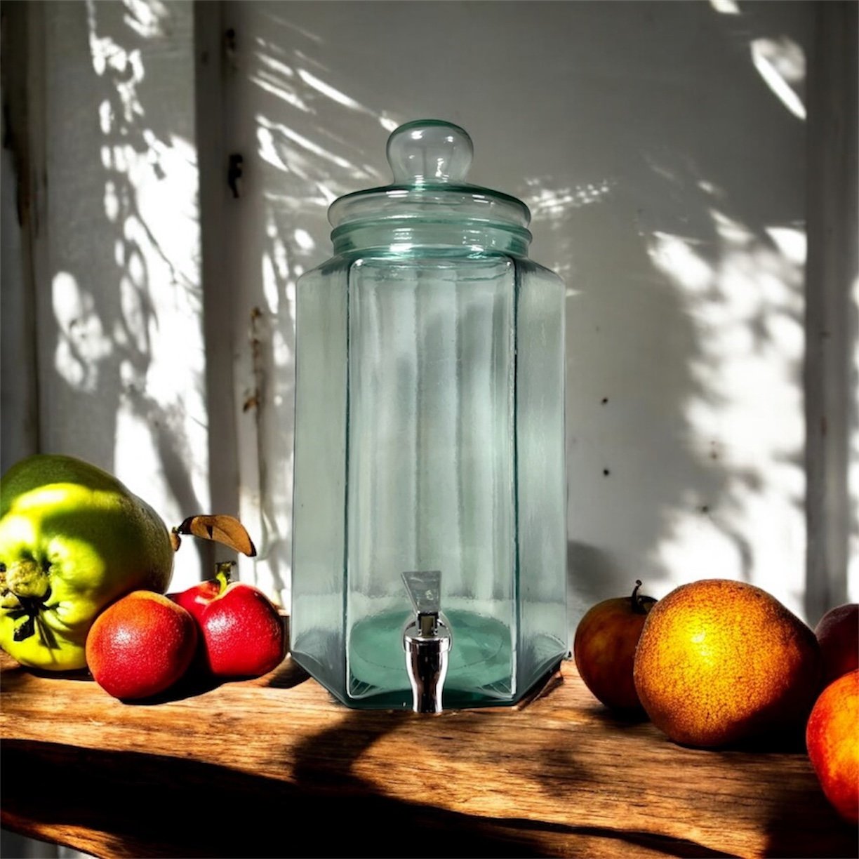Découvrez notre superbe bonbonne hexagonale en verre, rappelant les fontaines d’antan, conçue pour savourer avec élégance vos huiles, limonades ou infusions glacées. Son large bouchon facilitant le remplissage et son robinet pratique pour le service en font un objet à la fois esthétique et fonctionnel. Idéale pour servir vos huiles d’olive, boissons ou sirops, elle devient le point central de vos buffets, permettant à vos invités de se servir facilement tout au long de votre événement. Disponible en deux formats pour s’adapter à toutes vos occasions, avec, pour le modèle 6,5 L, la possibilité d’ajouter une rehausse en fer forgé pour un effet encore plus élégant.