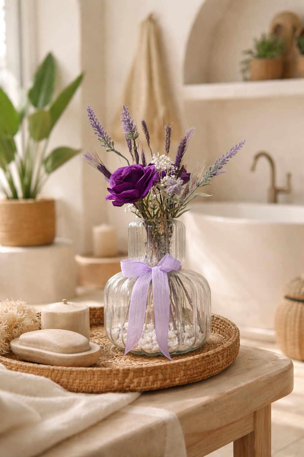 Cette composition florale aux teintes violettes et lavande capture l’essence d’un intérieur baigné de lumière, inspiré des maisons méditerranéennes. Délicatement mise en valeur dans un vase en verre texturé, elle associe une rose profonde à des épis et roses artificielles aux nuances violets et naturelles.