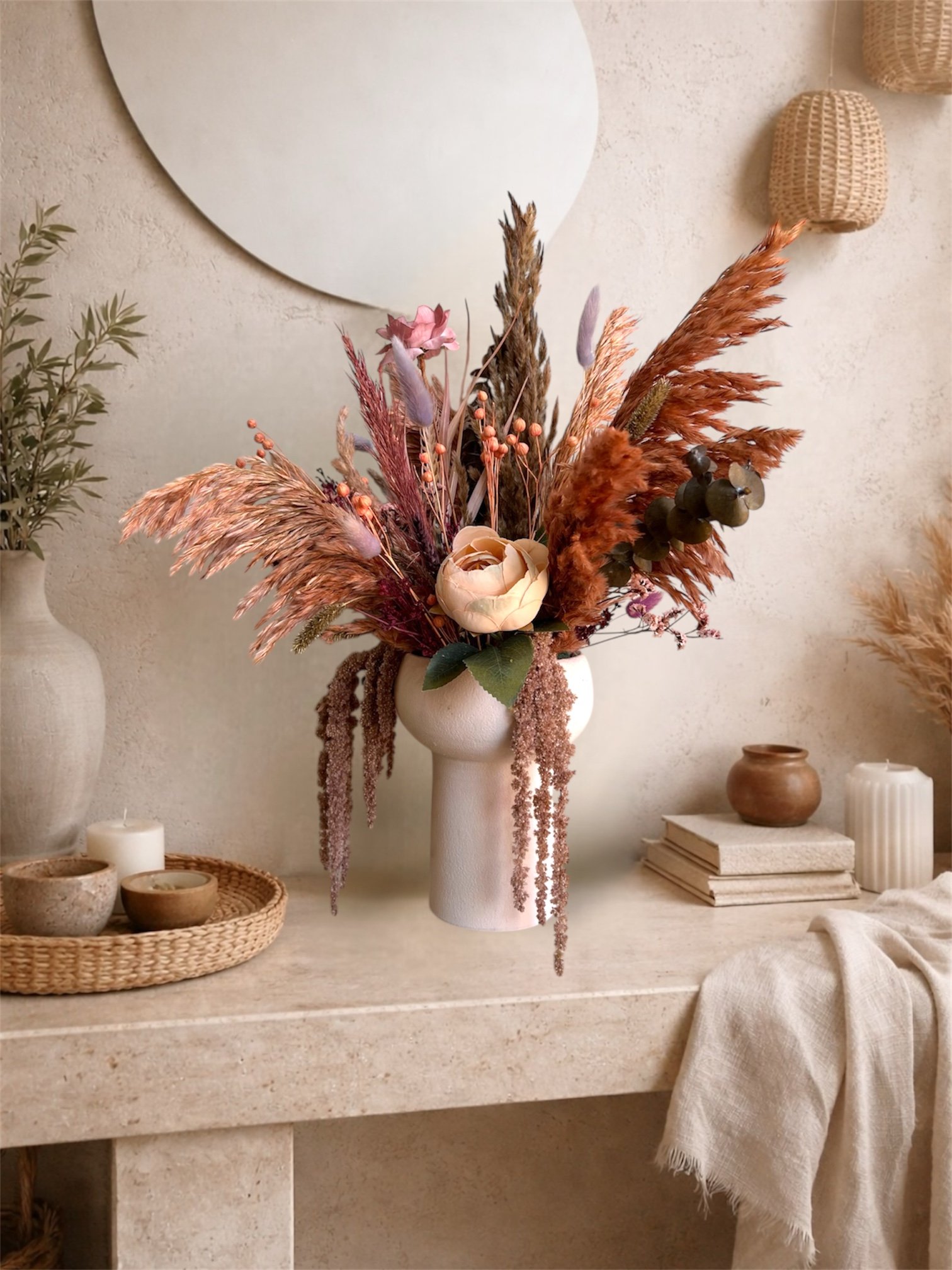 “Esprit Bohème” est une création florale unique, célébrant la douceur et l’élégance naturelle. Les fleurs sélectionnées, aux nuances de beige, rosé et tons chaleureux, sont disposés avec soin dans un vase beige rosé aux courbes minimalistes, créant un équilibre parfait entre naturel et sophistication.