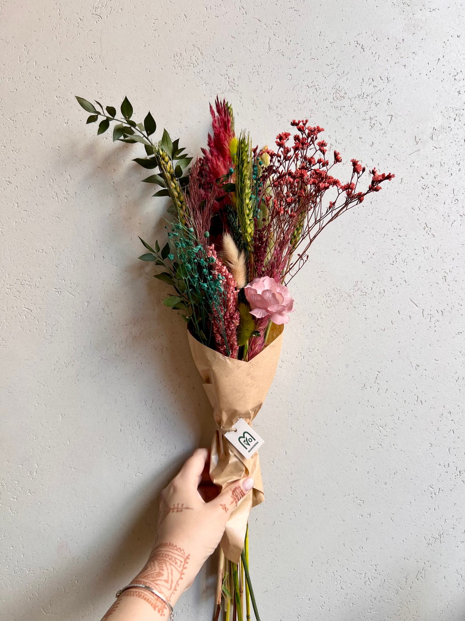Bouquet de fleurs séchées aux nuances green pensé pour réchauffer votre intérieur avec élégance.