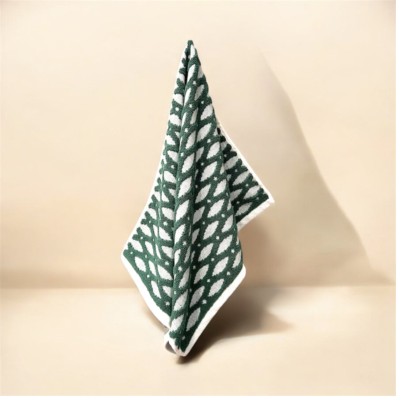 Apportez une touche d’élégance à votre salle de bain avec cette serviette en coton doux, décorée de motifs green et teintée d’un joli vert émeraude. Sa taille pratique en fait un accessoire idéal pour un usage quotidien.