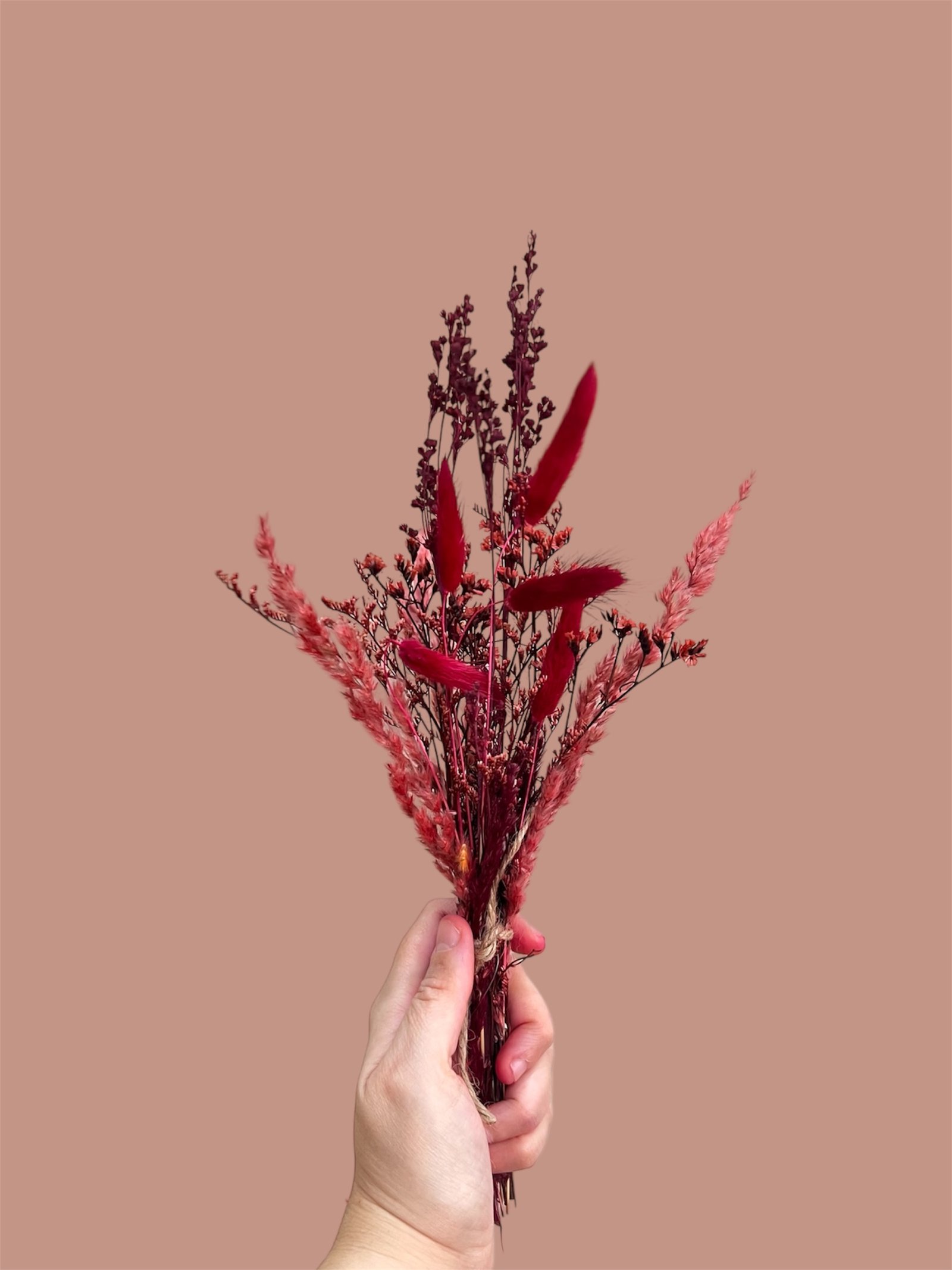 Mini bouquet de fleurs séchées aux nuances rouge, aubergine et bordeaux, pensé pour réchauffer votre intérieur avec élégance.