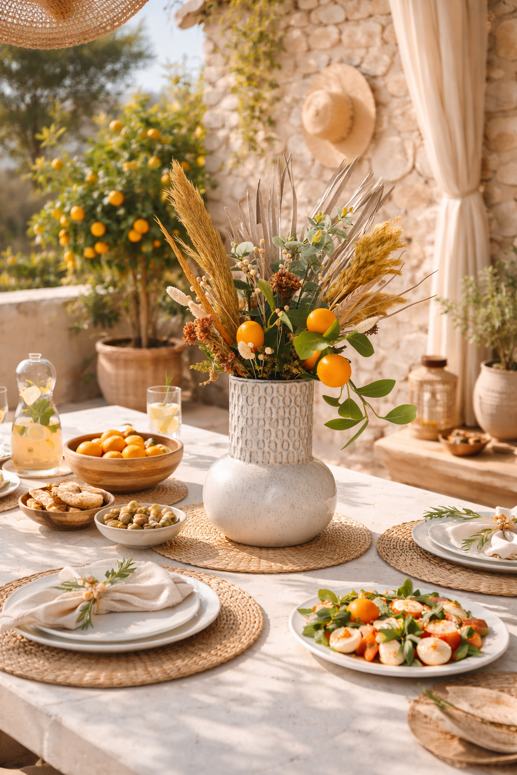 Présentée dans un joli vase en céramique aux lignes épurées, cette création associe avec subtilité des fleurs séchées aux textures naturelles et une branche d’oranger artificiel ornée de délicates petites oranges. Une touche inattendue qui insuffle fraîcheur, vitalité et originalité.