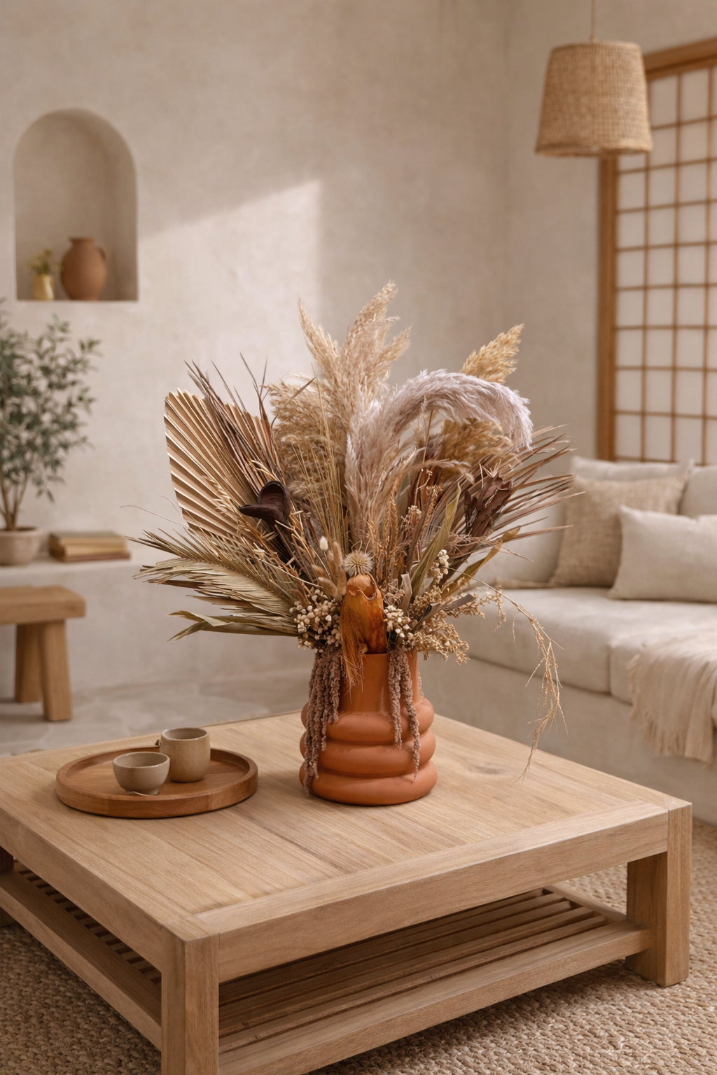 Présentée dans un vase terracotta, cette création florale joue sur l’équilibre des matières et des couleurs pour offrir une décoration à la fois sobre, élégante et intemporelle.