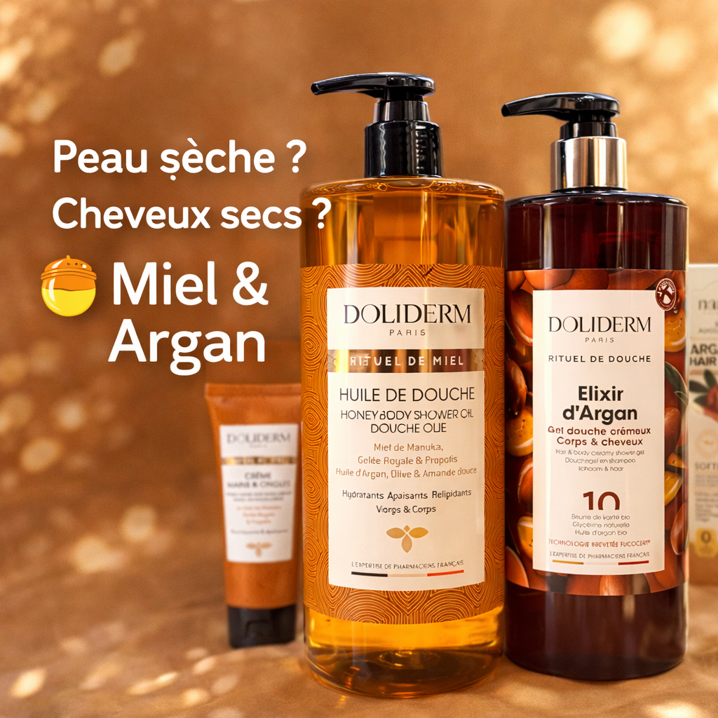 la puissance du miel & de l’argan au coeur de votre routine inspiré des rituels de soin naturels, le Rituel Miel & argan doliderme associe les trésors de la ruche et des huiles précieuses pour nourir, apaiser et sublimer la peau et les cheveux.